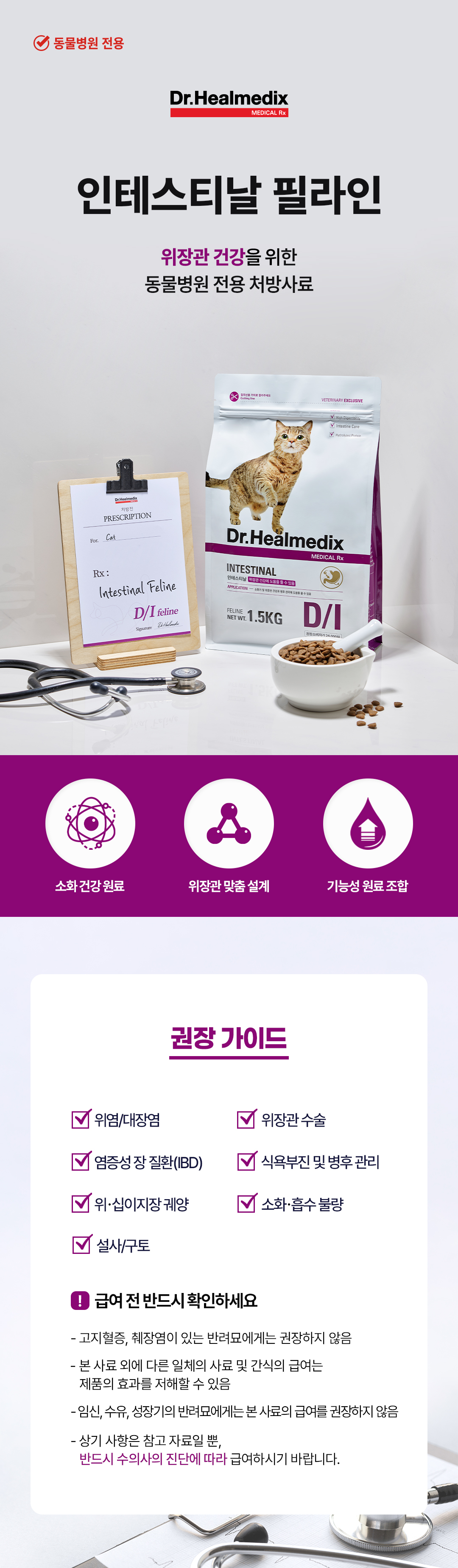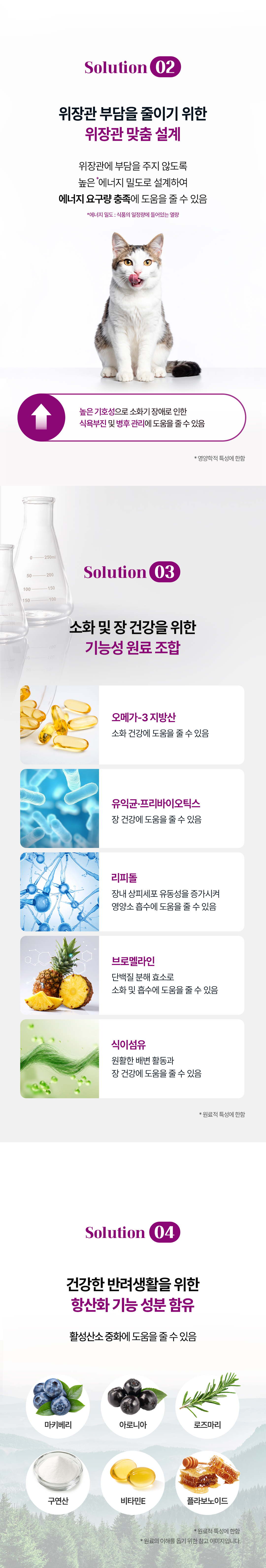 사용한 원료의 명칭 쌀,가수분해닭고기분말,가수분해대두단백질,정제닭기름,정제대두유,아마종실,정제어유(청어유),가수분해닭고기분말(천연향미제),계란분말,바나나분말,비트펄프,정제섬유소,맥주효모,프리바이오틱스(프락토올리고당,이눌린),유익균(Bacillus subtilis,Lactobacillus acidophilus 등 5종),타우린,염화콜린,베타카로틴,DL-메티오닌,L-라이신,비타민제합제,미량광물질류합제,비타민C,유기태미네랄,단백질분해효소,유카추출물,페뉴그릭,베리믹스(마키베리,아로니아),항산화제(로즈마리,비타민E,구연산,플라보노이드),규조토,리피돌,차전자피,길경추출분말,브로멜라인,식용달팽이추출분말 ■유전자변형(대두)포함