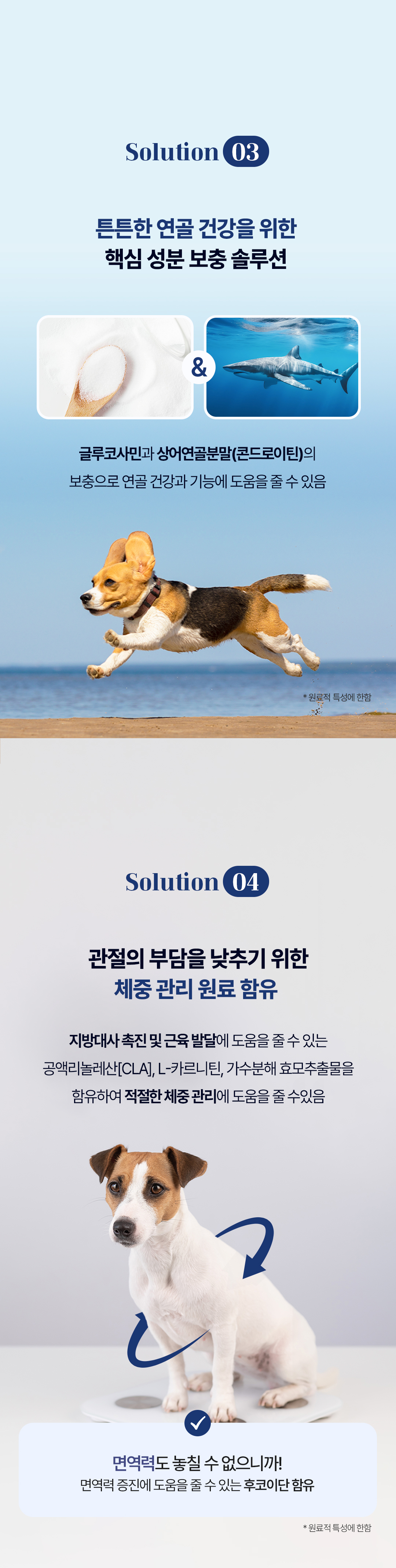 원료명칭 쌀,생선살,탈지대두,연어오일,식물성 글리세린,셀룰로오스(아르보셀),가수분해 닭고기분말,유화제,타피오카 전분,탄산칼슘,레시틴,비타민 및 미네랄 합제(A,D3,E,B1,B2,C,B6,B12,판토텐산,나이아신,바이오틴,엽산,철,망간,아연,요오드),L-카르니틴,메틸설포닐메탄(MSM),상어연골분말(콘드로이틴),공액리놀레산(CLA)분말,보스웰리아,글루코사민염산염,정제어유분말(오메가-3),후코이단,식용달팽이추출분말,효모추출물,프락토올리고당,로즈마리추출물,비타민C,토코페롤,산도조절제,홍국적색소,소르빈산칼륨 ■유전자 변형 대두 포함 가능성 있음